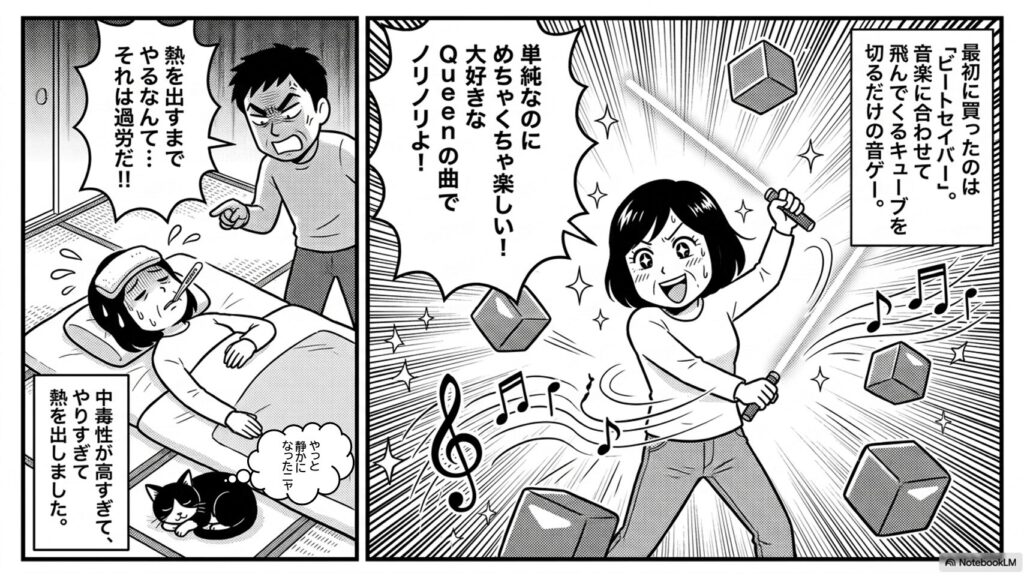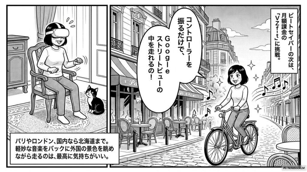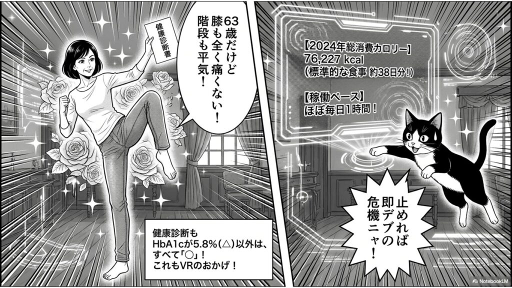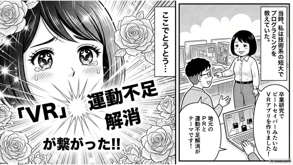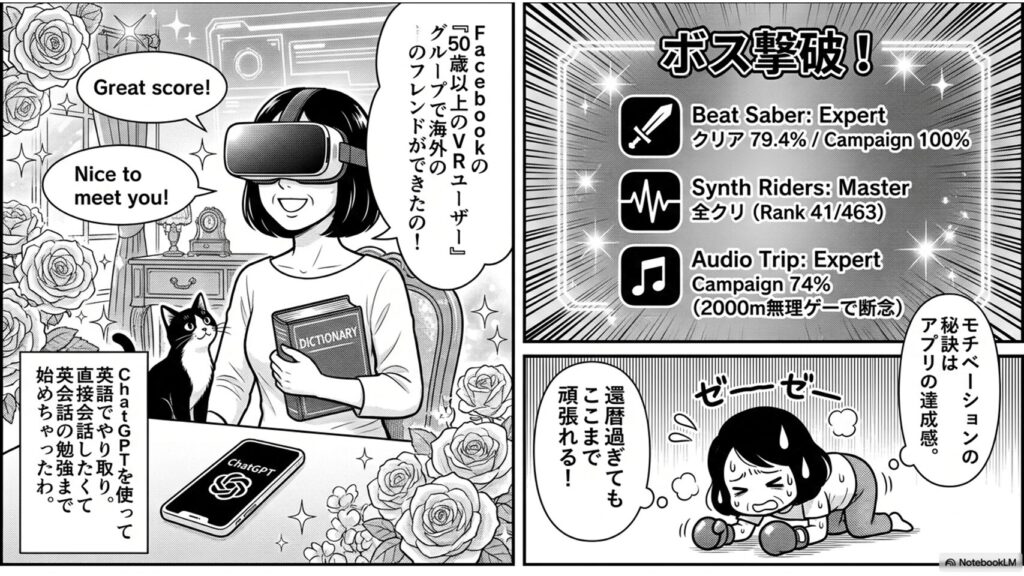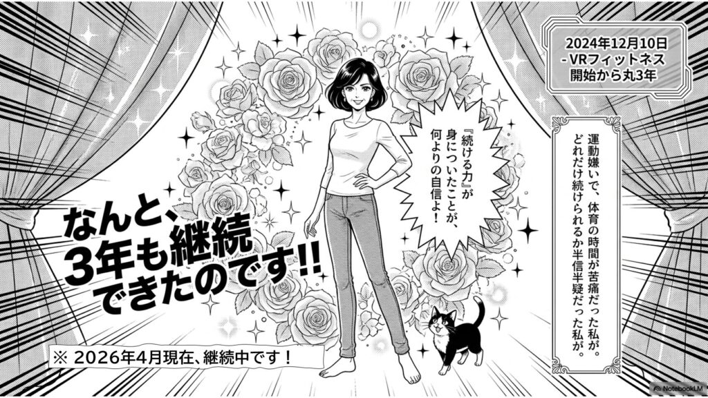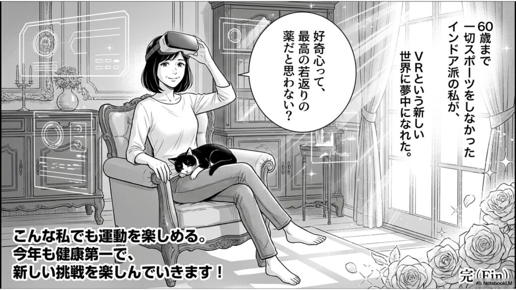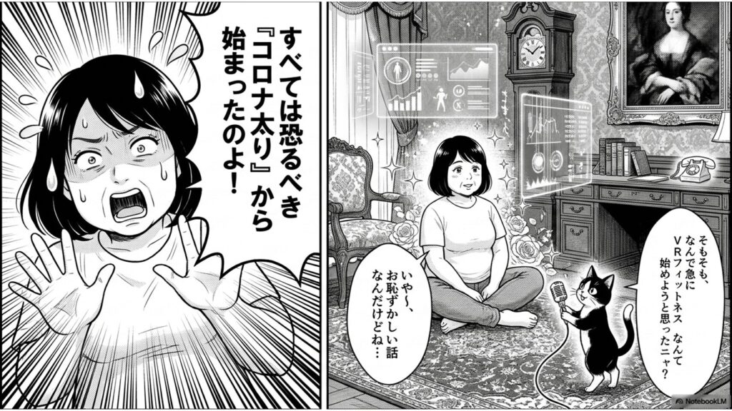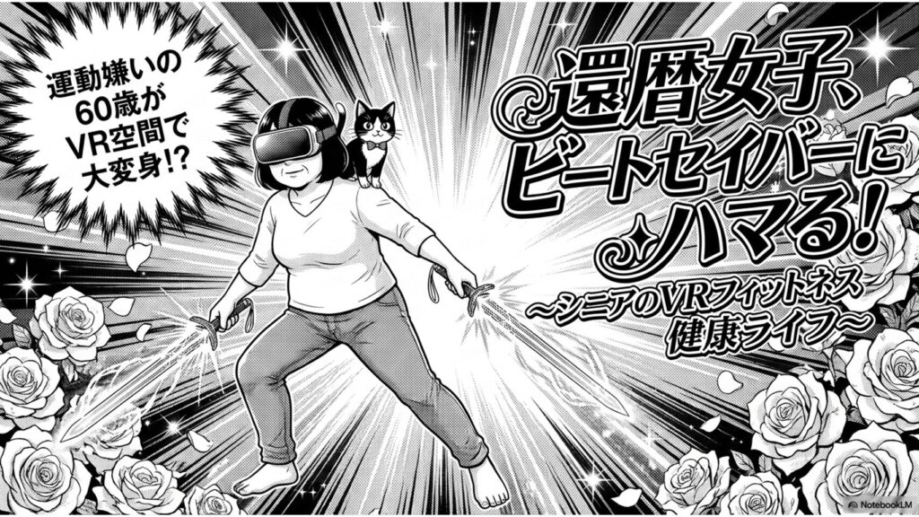 今回は、NotebookLMに自分のBlogを読ませて、VRフィットネス体験記をマンガ風スライドにしてみました。